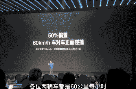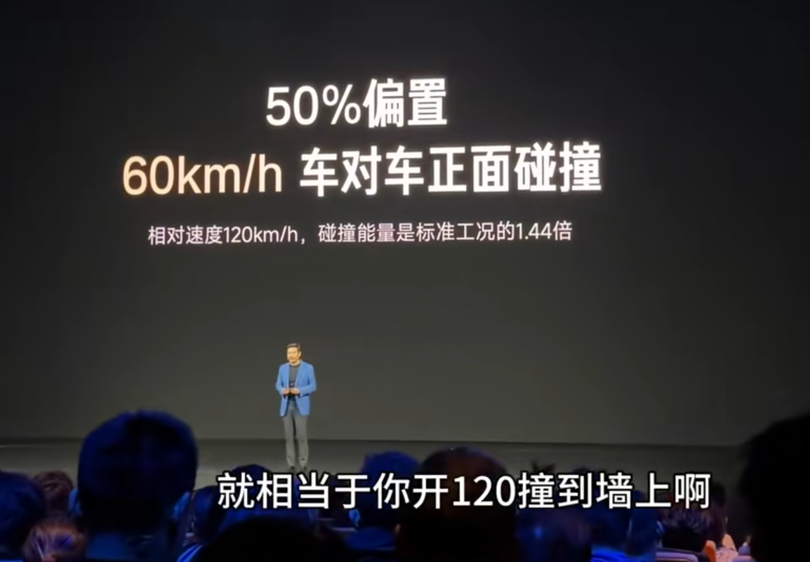 “两辆车都是60公里每小时,相对时速是一百二;就相当于你开120(时速)撞到墙上啊,50%;好,这个碰撞能量是标准测试工况的1.44倍,其实速度越快,它的这个碰撞能量是越大的啊。”这一段话来自小米新款SU7发布会,由雷军说出,之后迅速引爆全网。