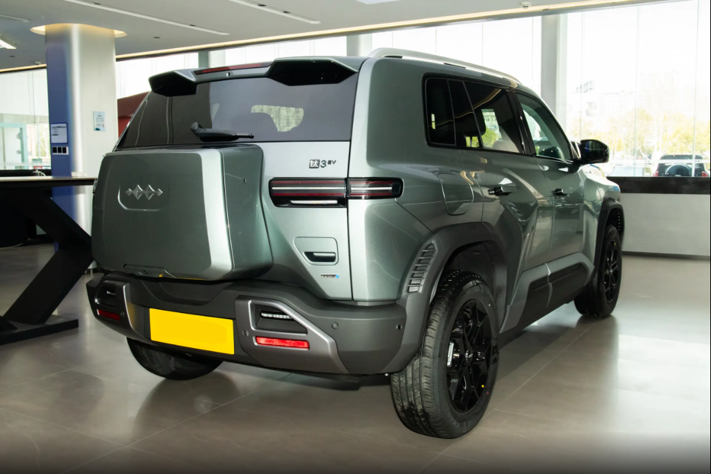 车身侧面是方中带圆的感觉,车顶平直,D柱很粗壮,前后翼子板都有很夸张的肌肉线条,力量感特别强。外扩的黑色轮眉还有仿导风槽设计,跟侧裙、前包围呼应得很到位。熏黑五辐轮毂很运动,再加上全隐藏式门把手,新能源的精致感也有了。此外,车辆的尾部设计是不规则的两段式后扰流板很亮眼,中间还有高位刹车灯。尾门那边还有方形小书包储物格,既能装东西,又特别硬派。尾灯是横向双层平行灯带,后包围和前脸前后呼应,整套设计又时尚又硬朗,看完真的很加分。