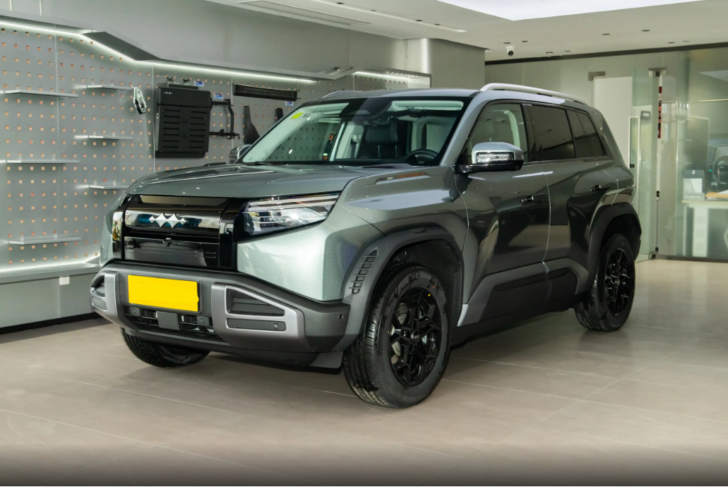 外观这块我也仔细看了,钛3闪充版还是延续了之前的机甲科技风,气场特别足。前脸是封闭式黑色中网,中间就是方程豹的 LOGO,两边是近似四边形的大灯,里面是双层灯眉加两点式LED灯,科技感一下就上来了。前包围用了凸出车身的黑色硬塑,再配上枪灰色饰件,硬派那味儿直接拉满。
