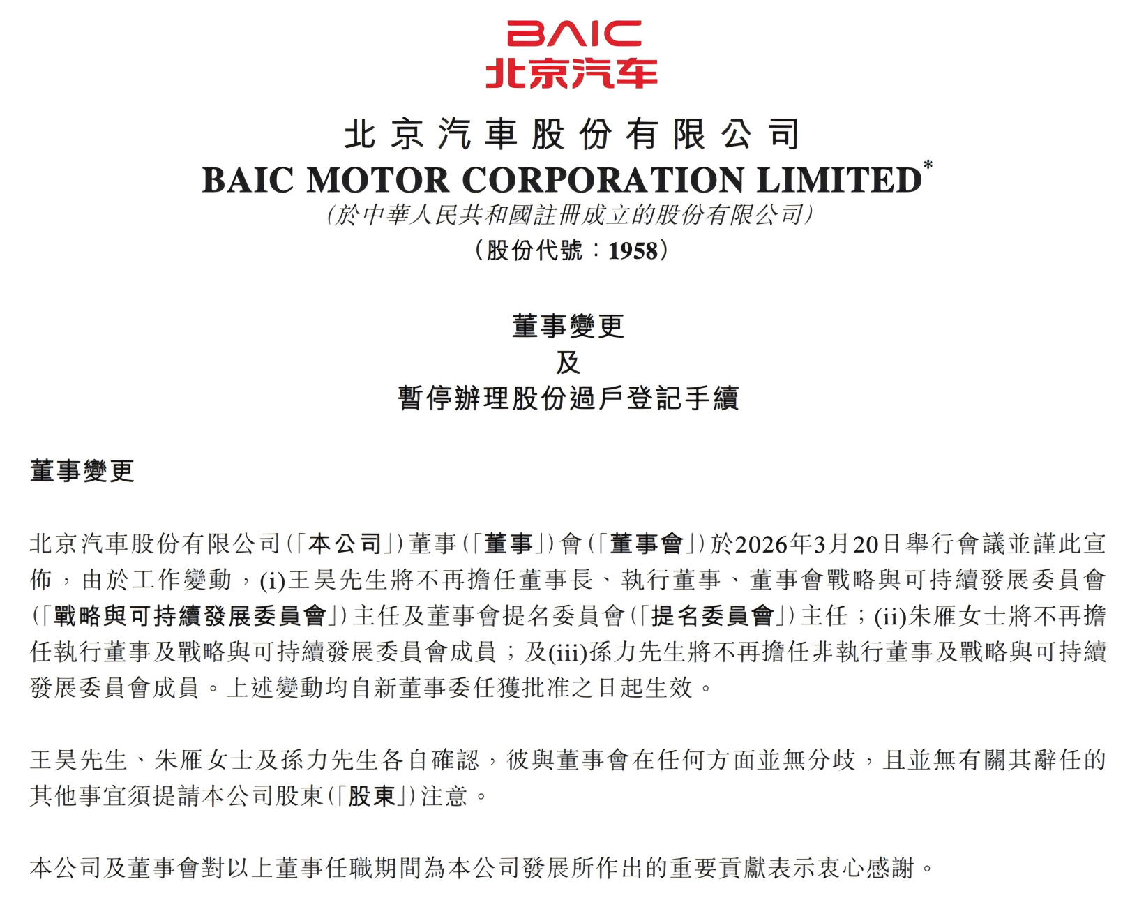 近日,北京汽车与北汽蓝谷同步发布人事调整公告,王昊因工作变动卸任北京汽车董事长,张国富获提名为非执行董事候选人并将接任董事长职务。这场为期一年的掌舵人更迭,绝非简单的常规人事调整,而是北汽这家中国汽车工业老牌国企,在合资红利全面消退、新能源转型进入深水区的行业大变局下,一次关乎企业命运的战略纠偏与路径重构。