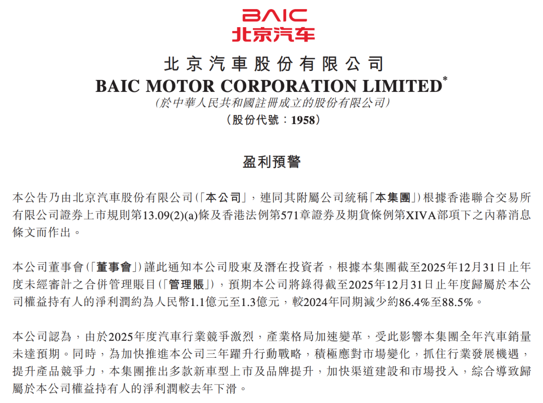 但王昊的改革始终未能触达北汽最核心的业绩命门——对北京奔驰的深度路径依赖。长期以来,北京奔驰为北京汽车贡献了超90%的利润,是这家车企绝对的“现金奶牛”。而2025年,北京奔驰全年销量同比下滑19%,创下在华销量近十年新低,税后利润同比暴跌38.7%,直接导致北京汽车全年归母净利润仅1.1-1.3亿元,同比下滑86.4%至88.5%,迎来连续三年的利润下滑,企业也因股价持续低迷被踢出港股通。对于高度依赖合资板块盈利的北汽而言,基本盘的失速,远比新业务的增长更致命。王昊的改革在增量市场实现了单点突破,却未能守住企业的盈利根基,也未能破解“合资输血、自主烧钱”的深层矛盾,这场一年任期的落幕,早已在业绩崩塌的趋势中埋下伏笔。