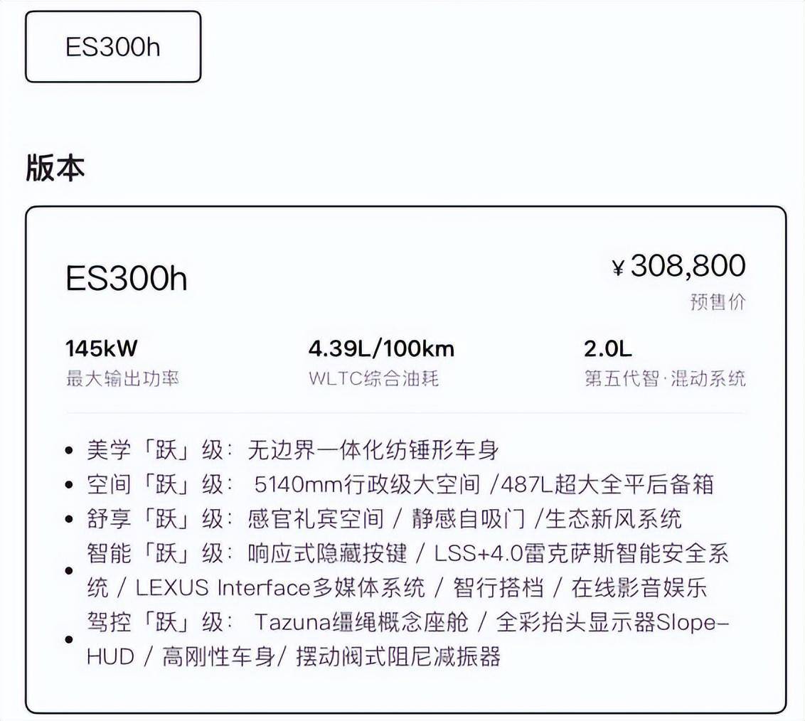 但问题出在动力和节奏上。ES300h搭载的2.0L混动系统,综合功率145千瓦,0-100km/h加速9.4秒。这个数据放在2026年,实在拿不出手——20万级的国产纯电轿车已经在玩“3秒级”加速了。即将推出的纯电版ES350e,电机功率165kW,加速8.9秒,比“网约车之王”埃安S还慢。