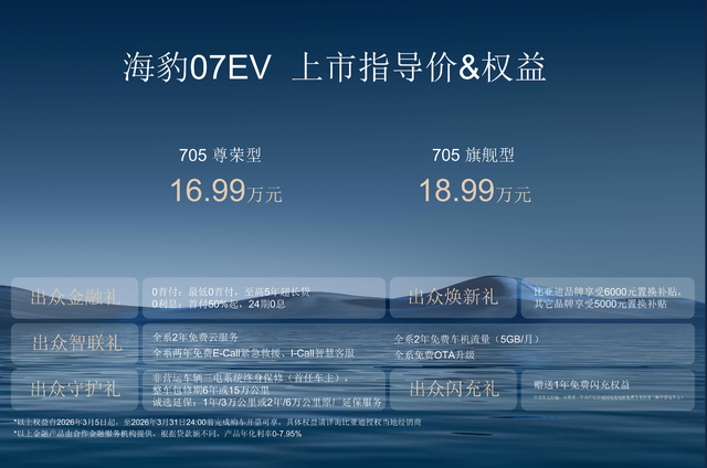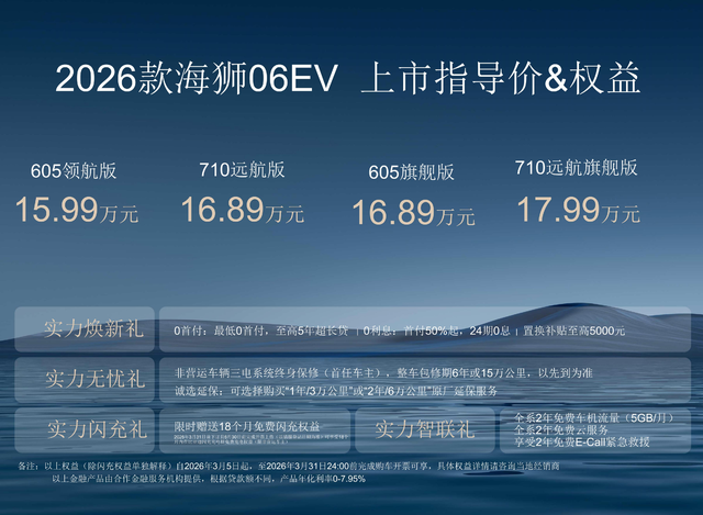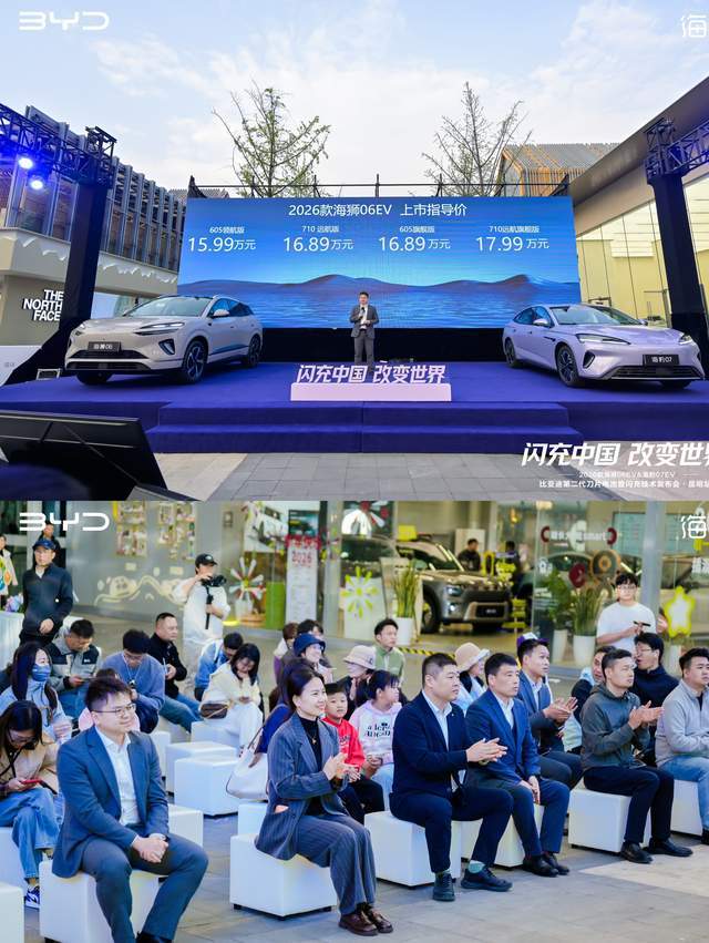 在全场嘉宾的热切期待中 ,两款新车的价格也在上市盛典中正式揭晓 ,其中 ,2026 款海狮 06EV 官方指导价为 15.99 万元-17.99 万元 ,并推出实力焕新礼、实力无忧礼、实力闪充礼、实力智联礼多重购车礼遇;海豹 07EV 官方指导价为 16.99 万元-18.99 万元 ,用户还可享出众金融礼、 出众焕新礼、 出众智联礼、 出众守护礼、 出众闪充礼多项购车礼遇。