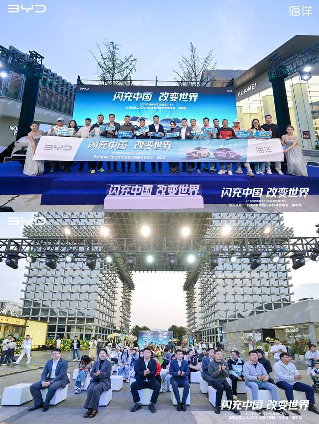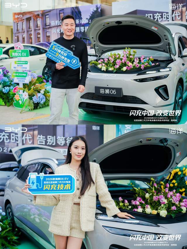 继 2026 年 3 月5 日比亚迪全球发布第二代刀片电池及闪充技术后,标志着比亚迪在新能源领域又树立起一块新的跨越式里程碑,这也将彻底改变新能源汽车市场补能格局。3 月21 日以“ 闪充中国·改变世界 ”为主题的比亚迪第二代刀片电池&闪充技术发布暨海洋网2026 款海狮 06EV、海豹 07EV 新车上市盛典·昆明站正式举行。来自云南的核心媒体、潜客及车主朋友们齐聚一堂,共同见证比亚迪海洋网“678 王炸组合”在昆明的震撼亮相,体验“ 闪充时代”带来的极致补能效率 ,以及比亚迪以技术创新终结续航焦虑的实力与决心。