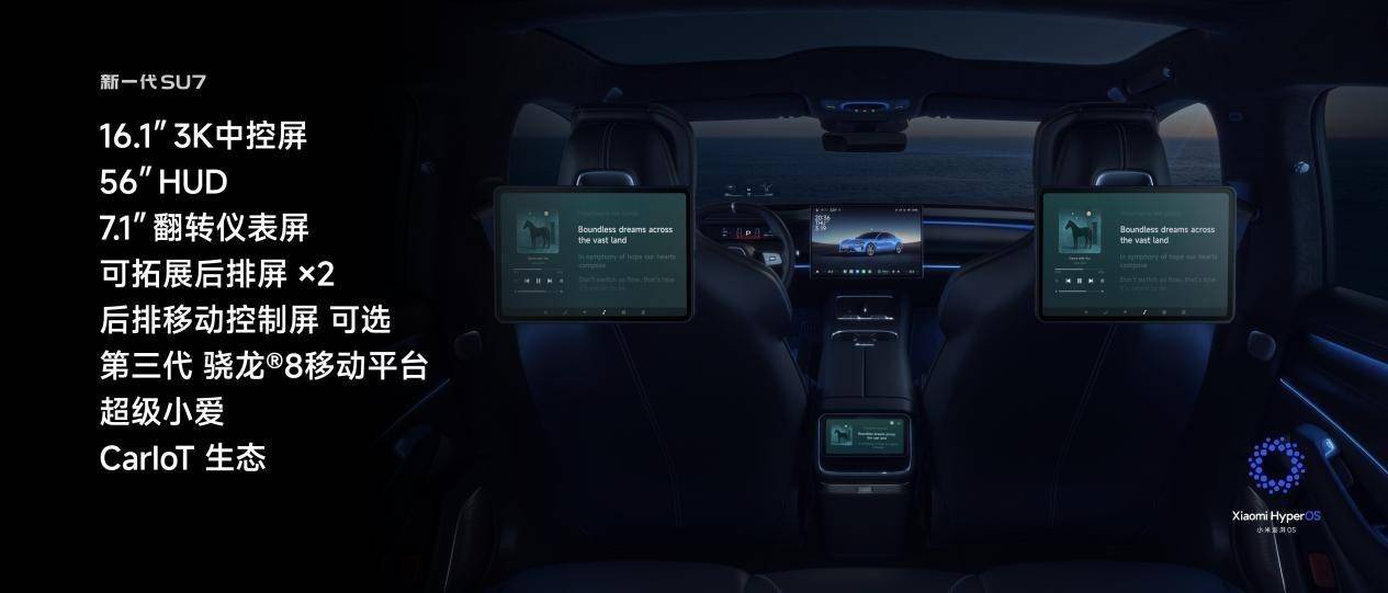 智能座舱方面,新一代SU7全系标配澎湃智能座舱,搭载第三代骁龙8移动平台和英伟达Thor车载计算平台(算力700TOPS)。「超级小爱」新增陪伴功能,支持跨会话长记忆、模糊导航规划及屏幕内容识别能力。后排配备可移动控制屏幕,支持六屏联动。