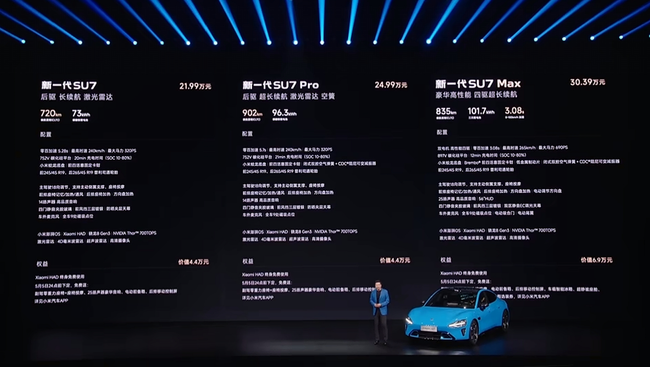 日前,小米汽车正式发布新一代SU7,定位为「新一代驾驶者之车」。新车提供标准版、Pro版与Max版三个配置,售价分别为21.99万元、24.99万元与30.39万元。虽然相比第一代车型涨价4000元,但开售34分钟锁单量就突破1.5万台,这是要预定今年的爆款了?