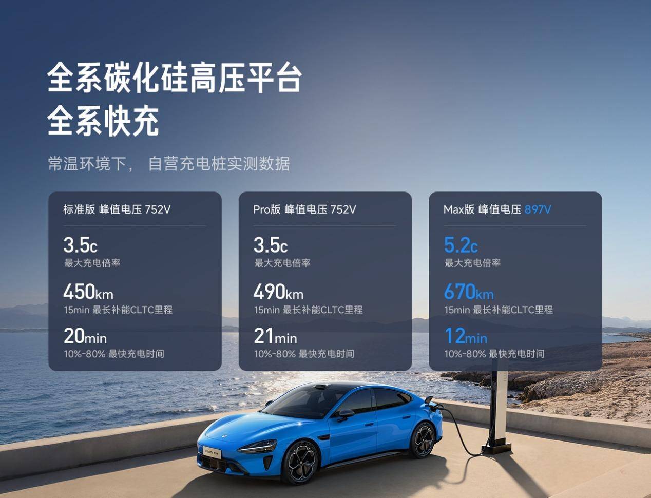 新一代SU7在三电系统上全面升级。全系搭载小米超级电机V6s Plus,最高转速达22000rpm,Max版零百加速最快3.08秒,最高时速265km/h。续航方面,标准版CLTC续航720km,Pro版为902km,Max版为835km。充电效率同步提升,标准版和Pro版升级为752V碳化硅高压平台,15分钟分别可补充450km和490km续航,Max版升级至897V碳化硅高压平台,15分钟看补能670km。