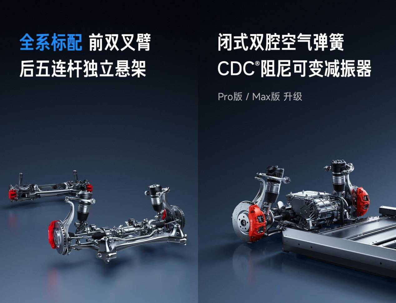 底盘方面,新车首发「小米蛟龙底盘」,Pro版和Max版配备闭式双腔空气弹簧和CDC阻尼可变减振器,支持悬架高度50mm范围内四挡可调。转向比12.5:1,转弯直径11.4米,优于同级平均12米水平。全系标配前四活塞固定卡钳和后265mm宽胎,制动与操控性能进一步提升。