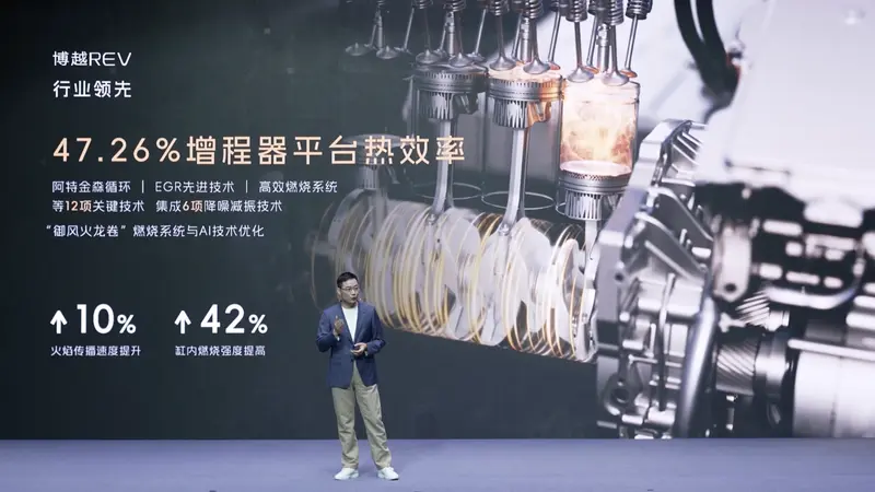 那实际上大家对于EV、PHEV、HEV等单词还是比较熟悉的,但是REV的确有点陌生。吉利博越REV搭载1.5L增程动力系统,其中1.5L发动机搭载阿特金森循环、EGR技术以及“御风火龙卷”高效燃烧系统等12项关键技术,这也使其热效率达到了47.26%,据吉利官方表示,该增程器可实现1L油发电3.77度,因此吉利博越REV馈电油耗仅需4.95L/100km。