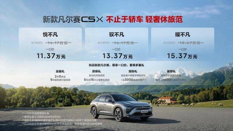 3月23日,东风雪铁龙新款凡尔赛C5 X自在上市,新车包括悦不凡、驭不凡、耀不凡三个版型。神龙汽车副董事长、总经理吕海涛公布了新车上市的一口价以及“四重好礼”,分别是悦不凡一口价11.37万元,驭不凡一口价13.37万元、耀不凡一口价15.37万元,以“不止于轿车 轻奢休旅范”的全新定位,在设计、舒适、科技等维度带来多项升级体验。此次升级,每一项配置调整都源于对用户真实需求的深度回应,配合更加透明的“一口价”政策,让法式魅力触手可及。