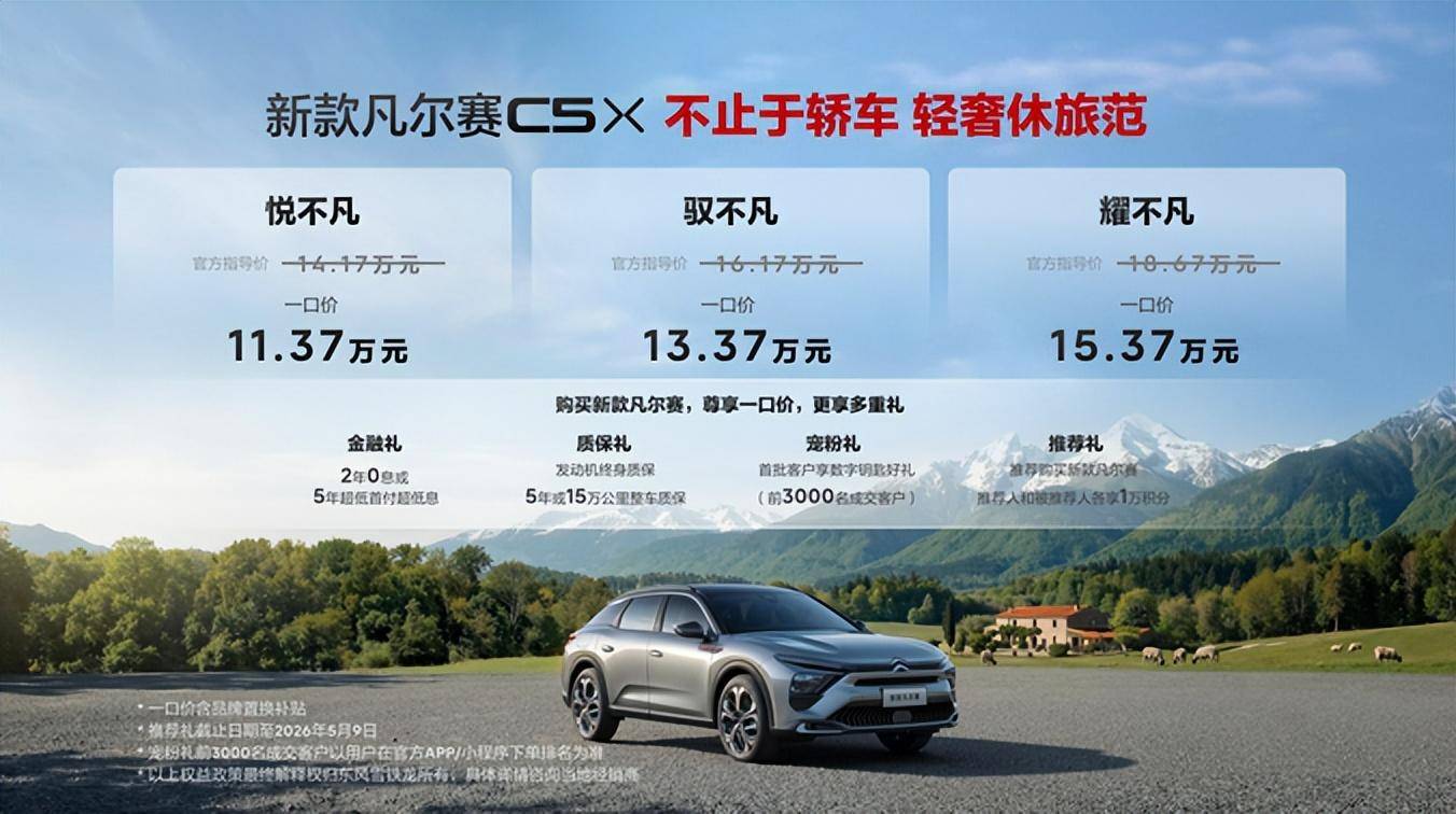 3月23日,东风雪铁龙新款凡尔赛C5 X以“不止于轿车 轻奢休旅范”的全新定位正式上市,共推出悦不凡、驭不凡、耀不凡三个版型,一口价分别为11.37万元、13.37万元和15.37万元。配合更加透明的“一口价”政策与多项配置升级,这款车试图回答一个更本质的问题:在用户多元化的日常场景中,一辆车究竟能扮演怎样的角色?