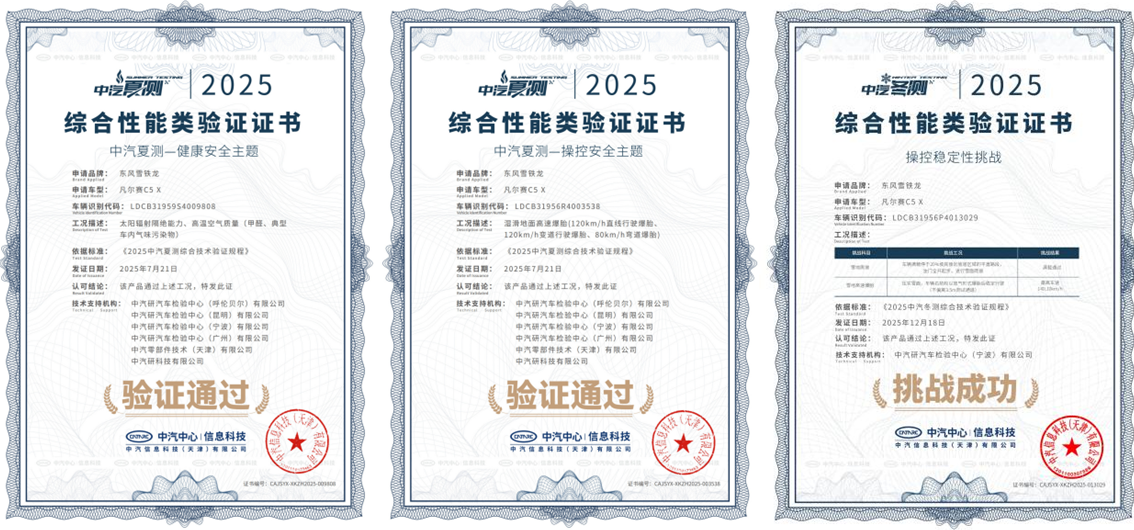 任何使用场景的舒适与便利,都建立在安全的基础之上。凡尔赛C5 X曾荣获中国十佳车身、C-NCAP五星安全认证。2023年国内首次高速连环追尾主被动安全联合测试中,以12项验证项目全部合格通过的成绩获得“3A”评价;2025年中汽夏测中,通过太阳辐射隔绝能力、高温空气质量及湿滑路面高速爆胎三大测试项目;同年极寒驾控安全主题技术验证中,以140km/h时速在压实雪面完成前轮爆胎测试。