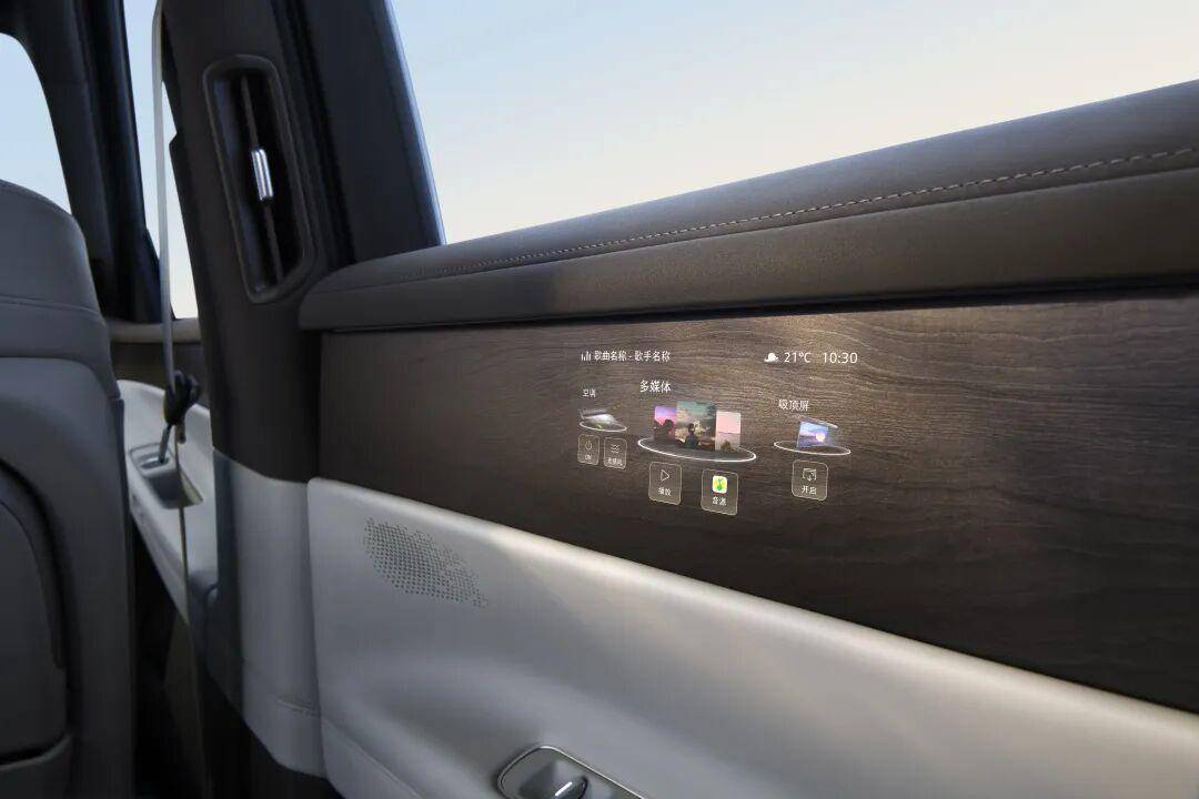 Smart Surface魔术屏提供了一个有趣的答案,通过微米级激光打孔技术,屏幕隐匿于木纹饰板之下,只有在需要使用时才精准浮现。这个设计的价值在于,它承认了一个基本事实:用户坐在车里,不是为了操作屏幕,而是为了出行。屏幕不应该成为座舱的视觉中心,而应该像其他功能一样,在需要时出现,在不需时隐退。