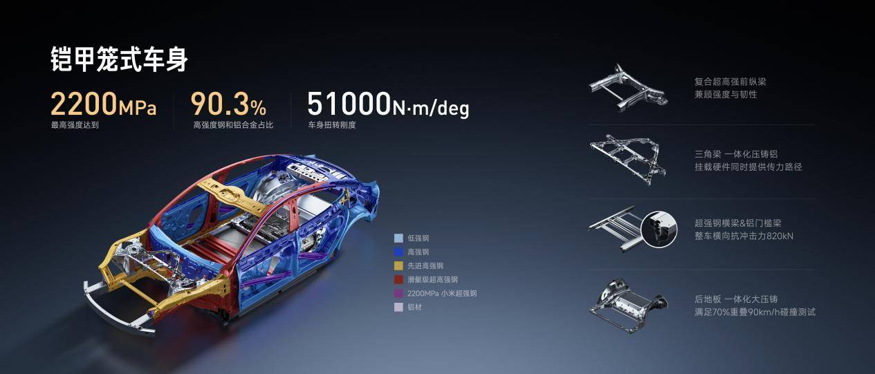 对小米汽车来说,安全始终是一切体验的前提与基础。新一代SU7依然采用行业最高标准打造,延续C-NCAP五星、C-IASI G+安全标准,通过全工况、全席位女性假人碰撞测试,测试覆盖范围及严苛程度均超出C-NCAP与C-IASI标准。全系标配2200MPa小米超强钢,为行业唯二实现量产的超高强度材料,整车高强度钢与铝合金占比达90.3%,显著提升车身结构安全性。