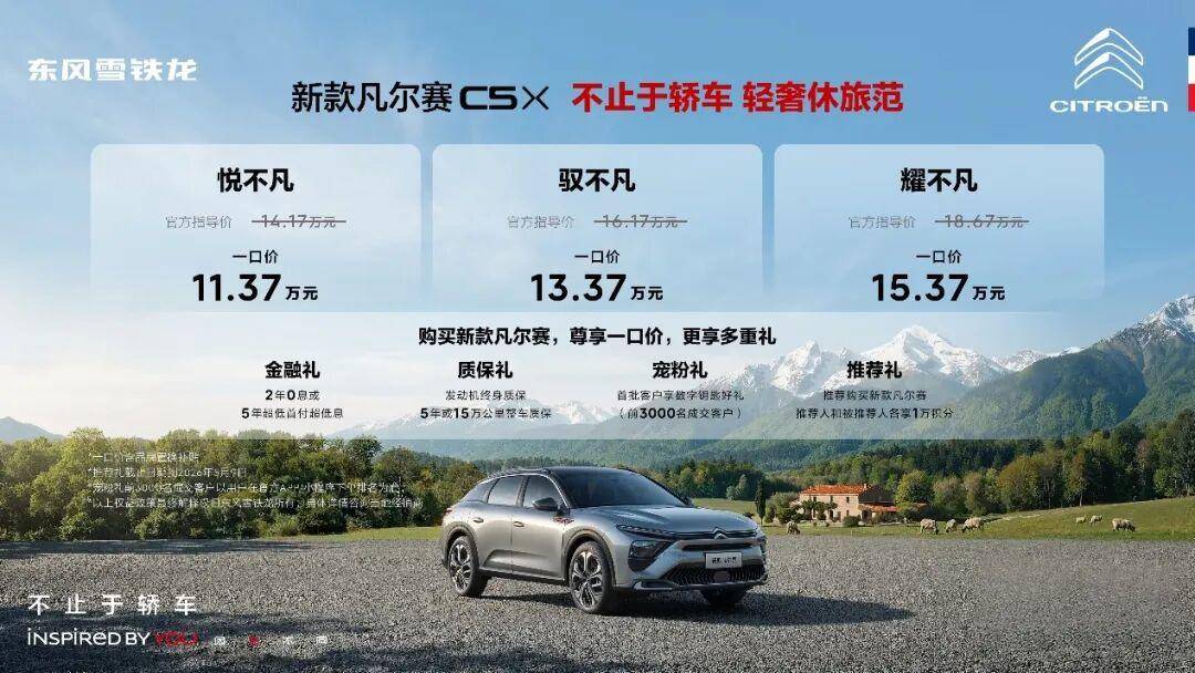 3月23日,东风雪铁龙新款凡尔赛C5 X正式上市,新车共推出悦不凡、驭不凡、耀不凡三款版型,官方采用一口价模式销售,三款车型售价分别为11.37万元、13.37万元和15.37万元。相较于此前在售车型的官方指导价,新车的“一口价”直接减去了2.5至3万元,定价策略颇具诚意。