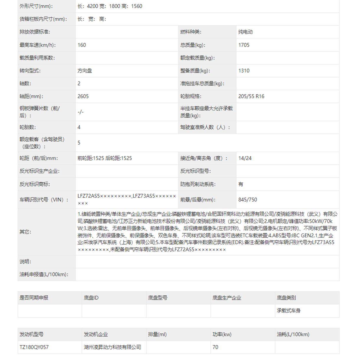 动力方面,新车申报了两种电机版本,最大功率分别为70千瓦和90千瓦,匹配磷酸铁锂电池。