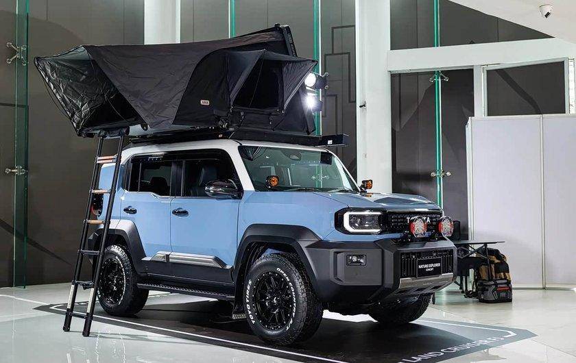 Nature Explorer概念车主打户外露营实用场景,车头搭载专属定制照明灯具,可更好满足夜间无照明非铺装路面行驶需求。车顶区域集成露营相关配置,包含可展开遮阳棚等户外装备,同时也配备了适配户外场景的越野轮胎,兼顾户外出行与轻度越野需求。