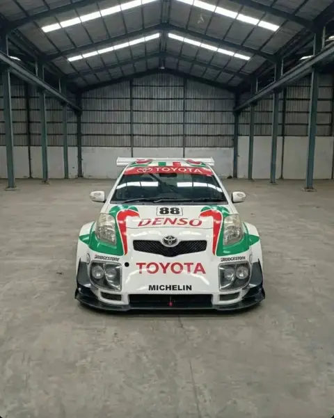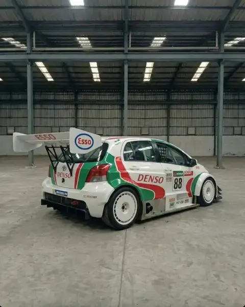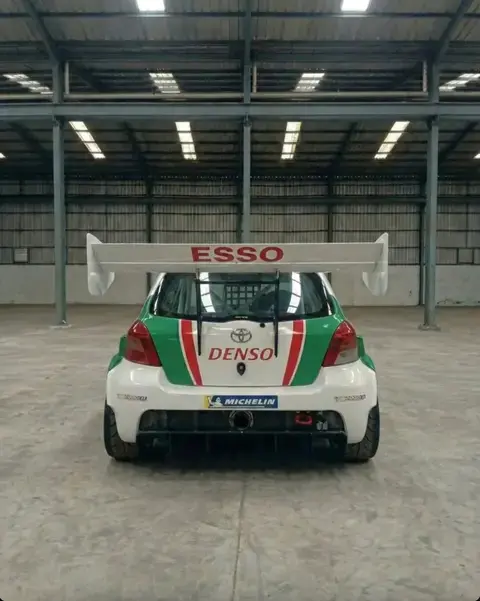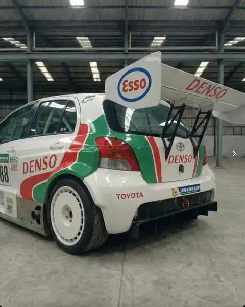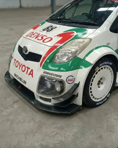 外观方面,这台雅力士已经彻底赛车化:前铲大幅向前探出,配合风刀和宽体翼子板;尾门延伸出尺寸夸张的尾翼;后扩散器体积巨大,完全是赛车规格。前包围两侧还额外增加了两对灯组应对夜间比赛,这设计就非常“勒芒”。白色车身上覆盖了丰田非常经典的红绿色赛车拉花。
