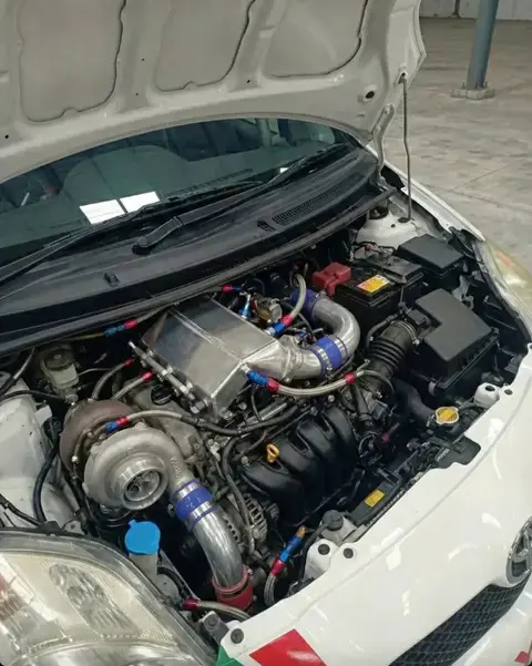 打开前机舱,可以看见原厂1.5L的发动机,还有一个巨大的涡轮,光是这配置已经是一般雅力士望尘莫及,而为了让布局更加合理,还采用了更高效更节约空间的水中冷。