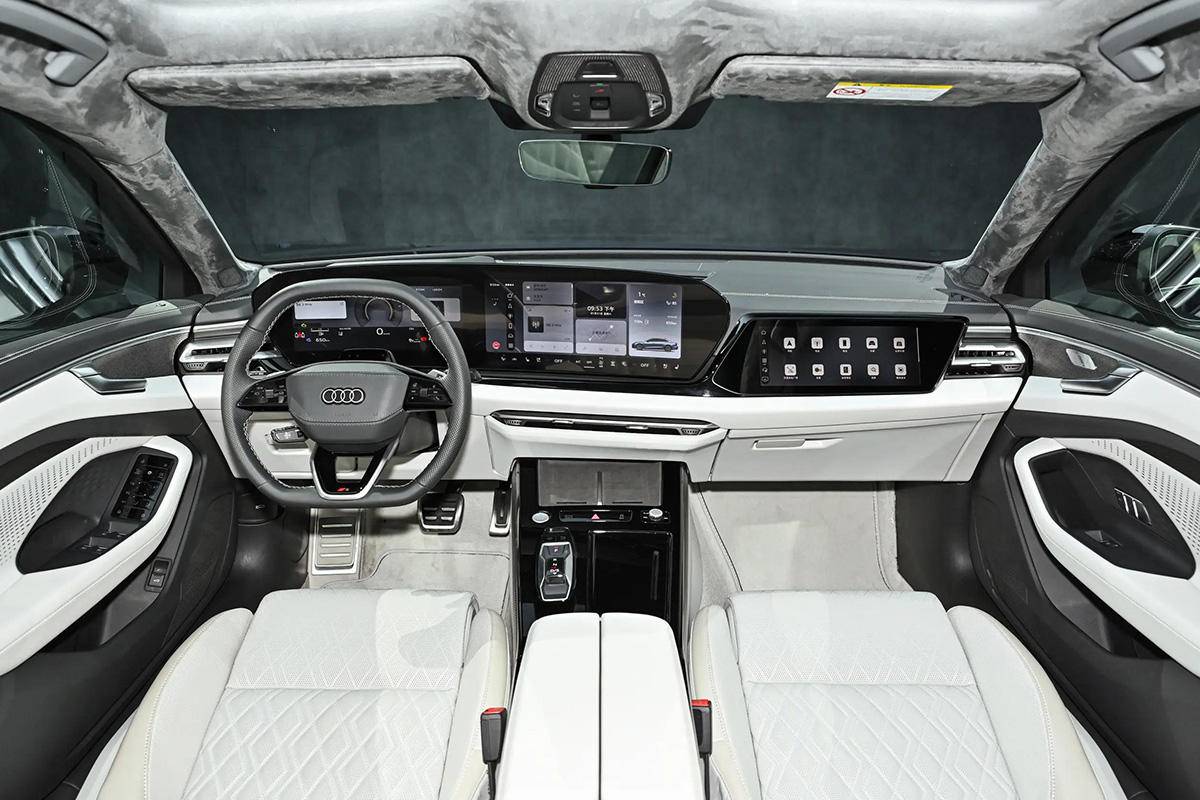内饰采用了全新一代家族设计风格,中控台造型布局和新款的奥迪A5L基本一致,使用了不规则的双联屏,副驾还有一块菱形外轮廓的显示屏。方向盘会有三幅式和四幅式两种版本。