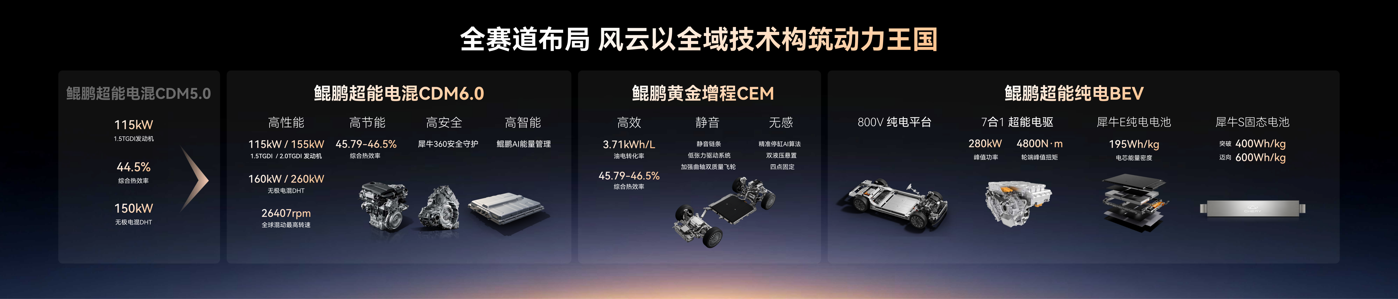 家用车既要省油,又要动力够,还要不焦虑,风云T9L搭载鲲鹏超能电混CDM6.0,用“235”全能实力,终结家用车偏科问题。