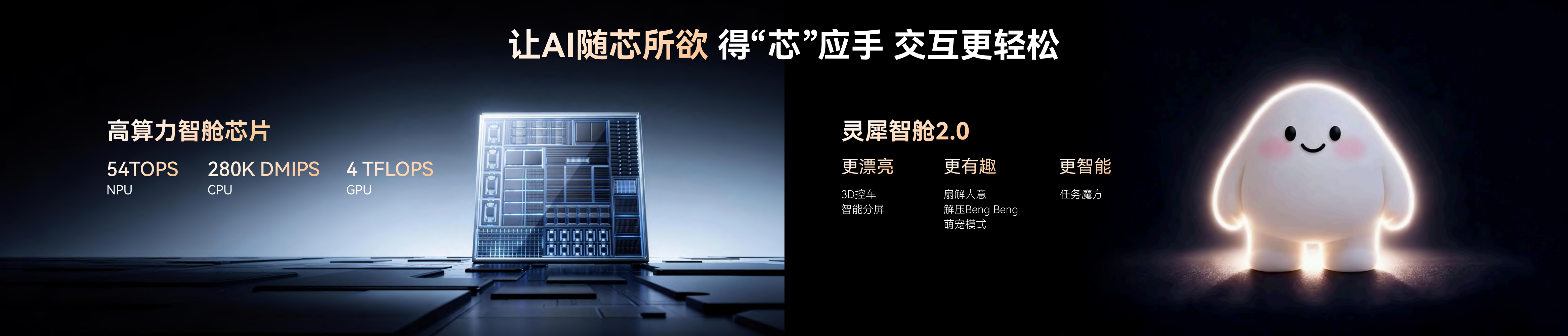 灵犀智舱2.0搭载同级唯一3nm座舱芯片,算力远超主流8295芯片,系统零延迟、十年不卡顿。13亿参数本地语音大模型,全场景免唤醒,4音区识别,老人孩子张嘴就能控车机、空调、导航,弱网也能用。