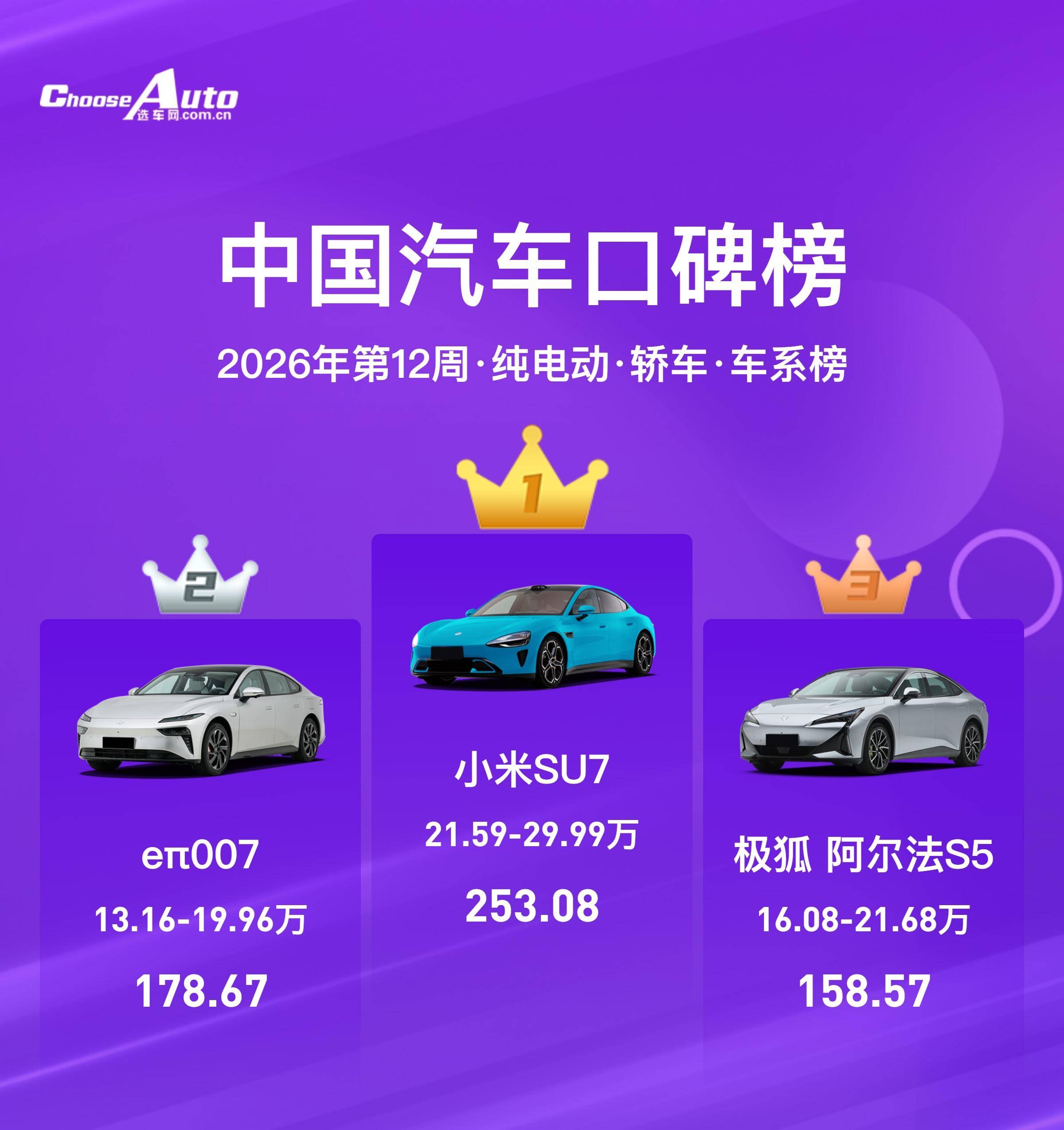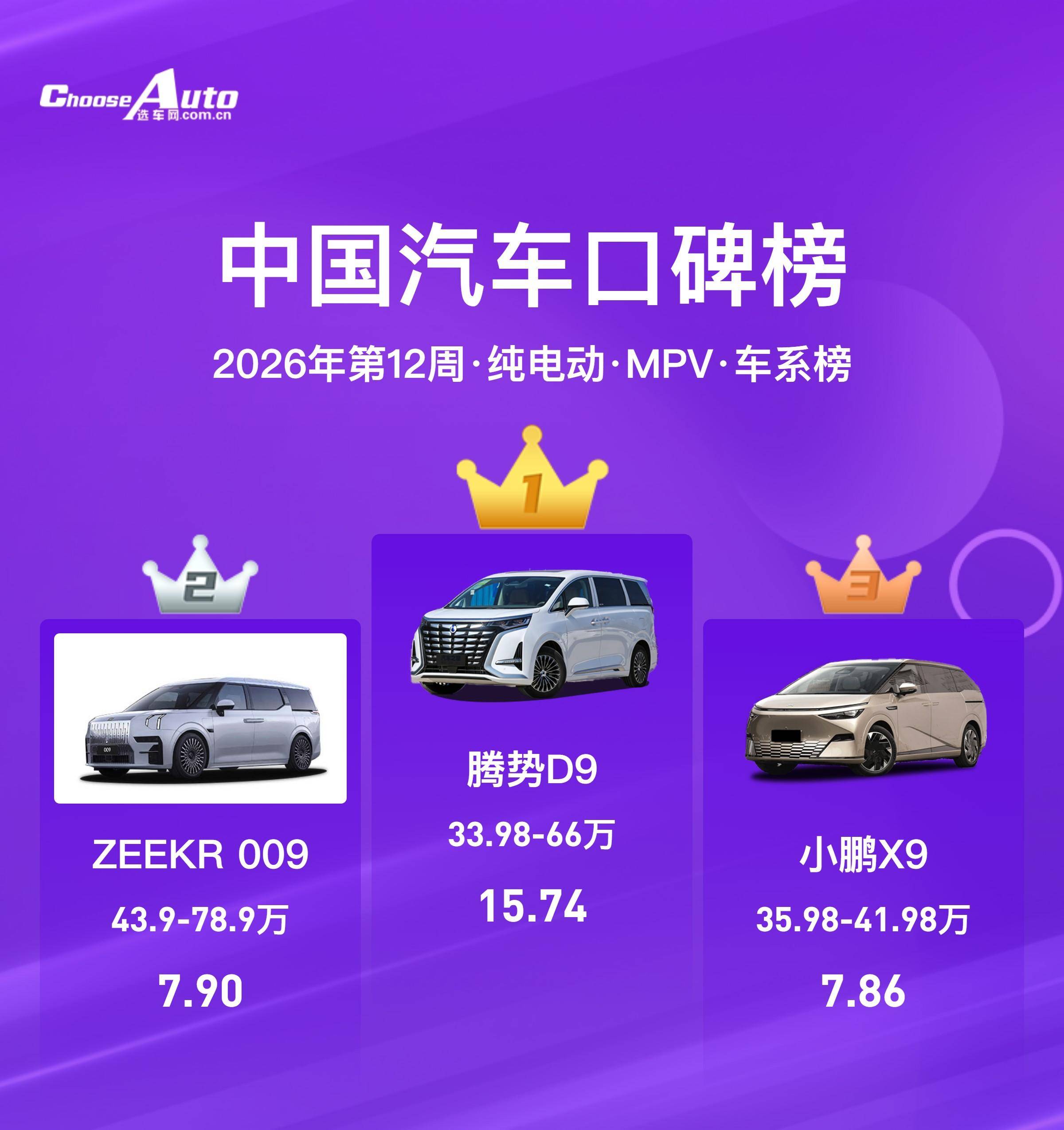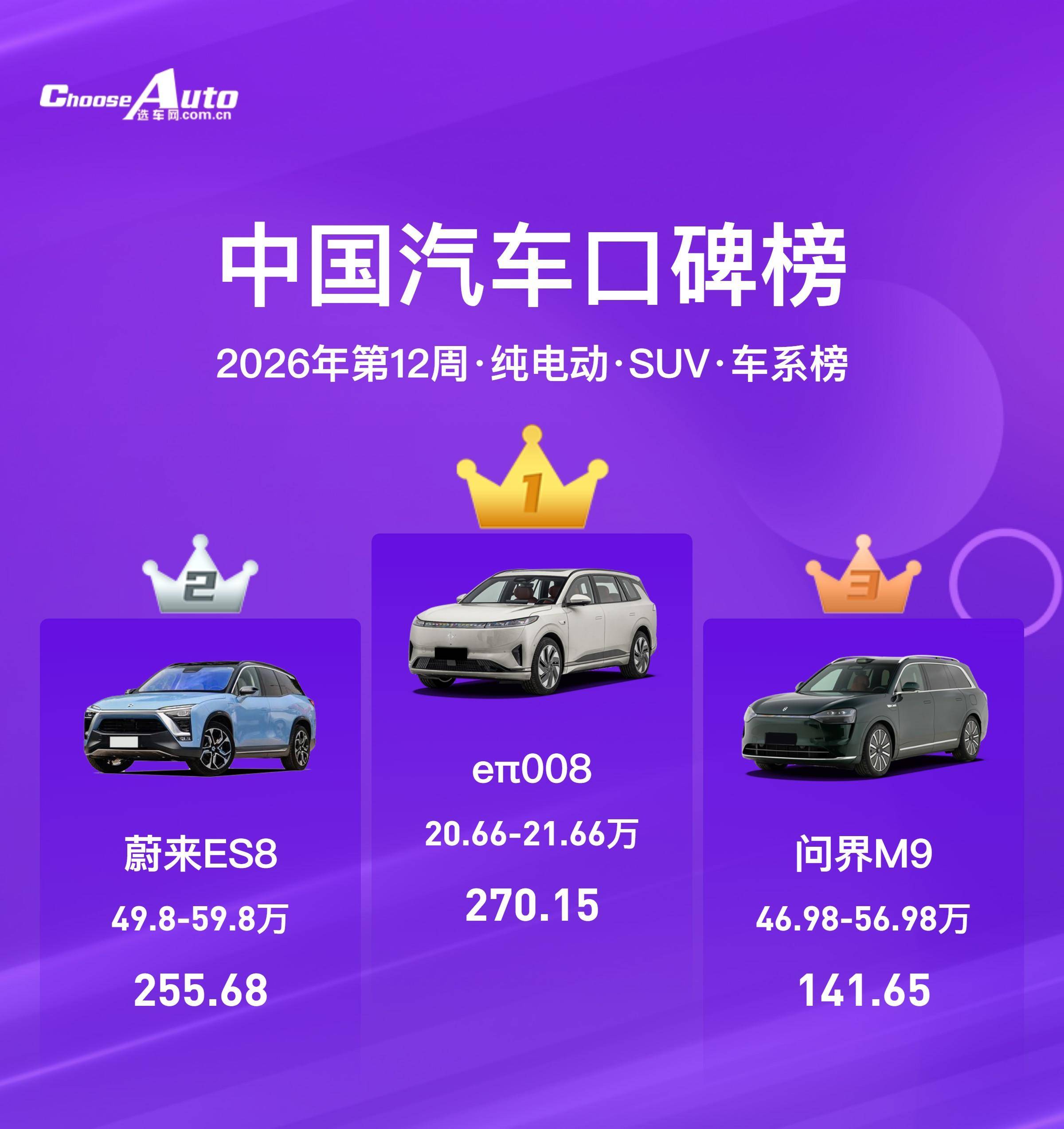 当我们谈论汽车口碑,数字背后藏的是千万车主的真实体验。选车网最新发布的 2026 年第 12 周纯电车型口碑榜,用三组细分榜单,把 SUV、MPV、轿车三个热门赛道的用户偏好摊开在眼前 —— 没有流量滤镜,只有实打实的口碑得分。