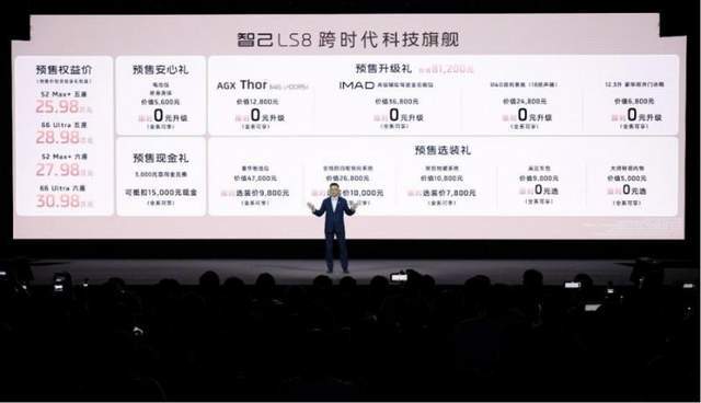 3月26日晚,智己LS8开启预售,推出大五座和大六座共4款车型,预售权益价25.98万元至30.98万元。发布45分钟内,小订数量突破10000台。从官方发布的配置表看,800V架构、双腔空气悬架、智慧四轮转向三项配置,全系标配,无论入门还是顶配均不例外。
