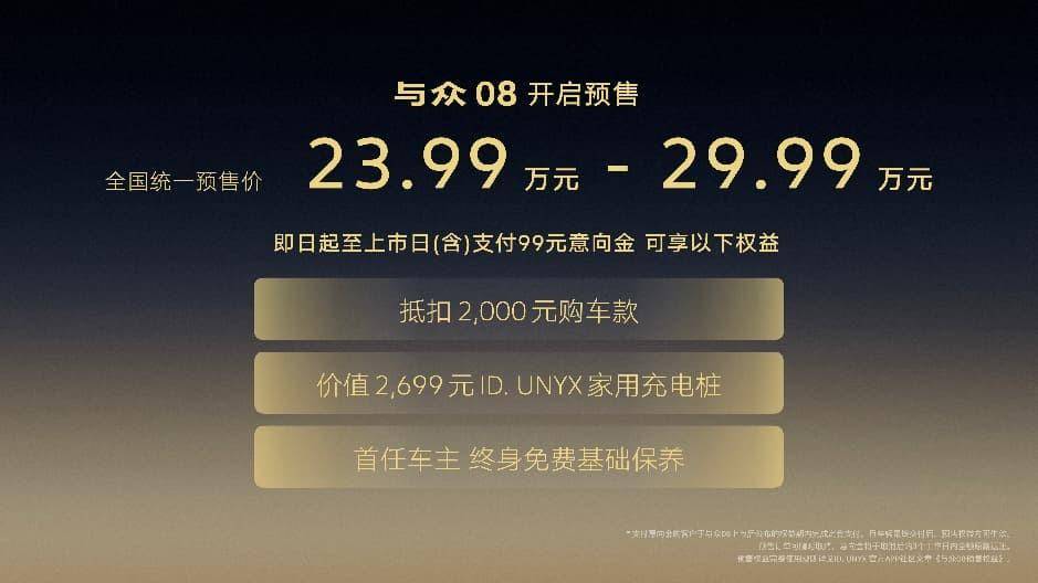 【2026年3月26日,合肥】作为强大产品攻势的序幕,今日,金标大众家族全新成员——首款全时互联全尺寸纯电SUV与众08在合肥完成首秀,并同步开启预售,预售价格为23.99万元-29.99万元。新车推出了限时预售权益。即日起,用户支付99元意向金,即可尊享三重礼遇:99元意向金直接抵扣2000元购车款;首任车主终身免费基础保养;赠送价值2,699元ID.UNYX家用充电桩。目前,与众08已陆续进入金标大众门店,客户可于门店预约试驾体验。