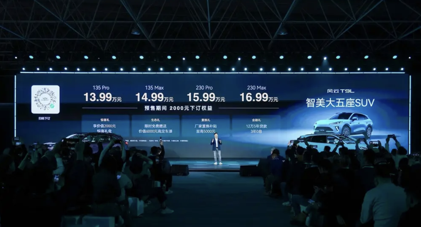3月25日,奇瑞汽车旗下全新“智美大五座SUV”——奇瑞风云T9L正式开启预售,新车推出4款配置车型,预售价区间13.99万元-16.99万元。新车不仅采用鲲鹏超能电混CDM 6.0技术,同时还将搭载犀牛电池,CLTC纯电续航最高达230km,高配车型上还将搭载猎鹰700辅助驾驶系统。