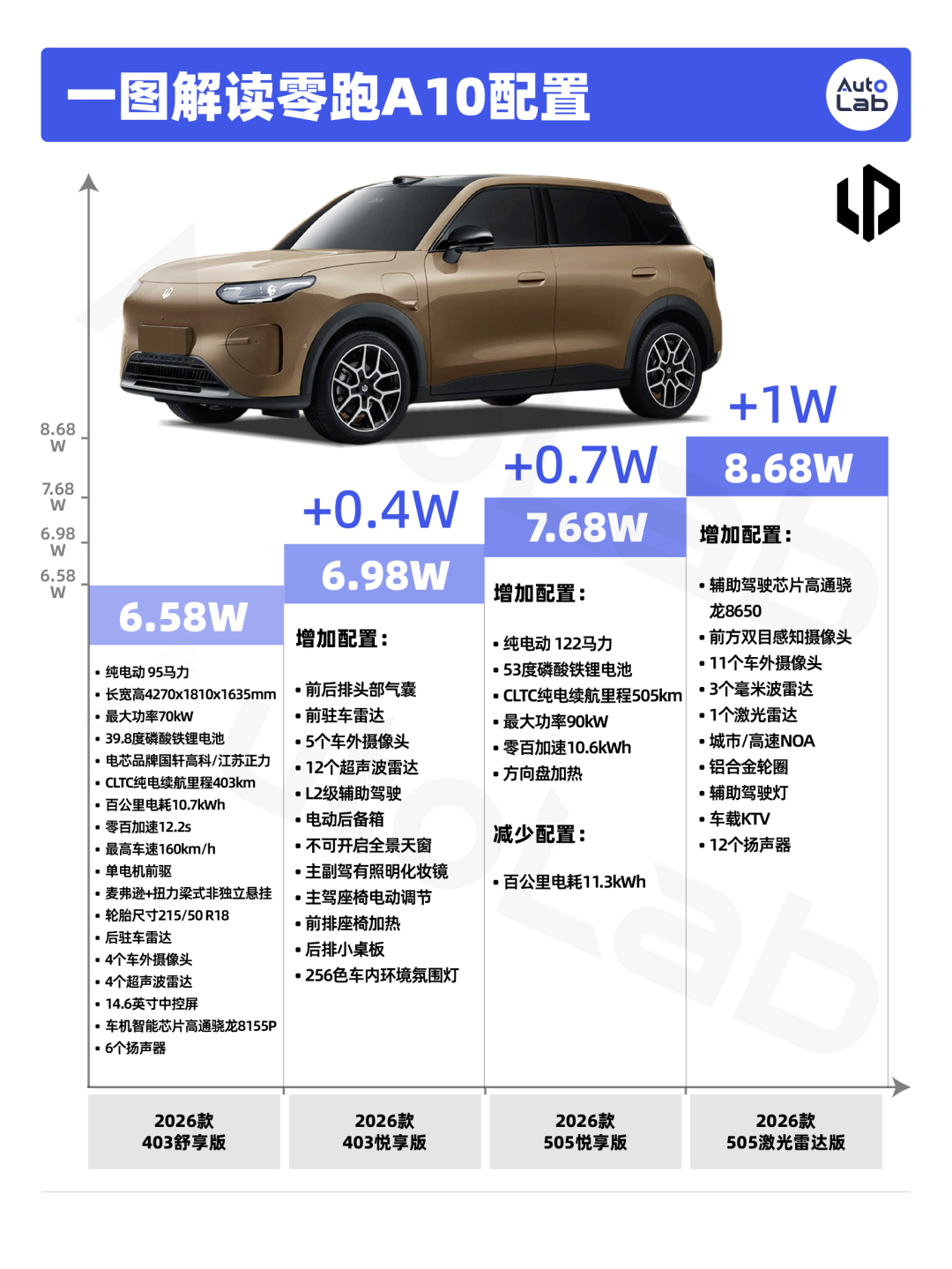 作为一款主攻10万级小型纯电SUV市场的车型,零跑A10共有4款配置,指导价被定在了6.58万-8.68万。