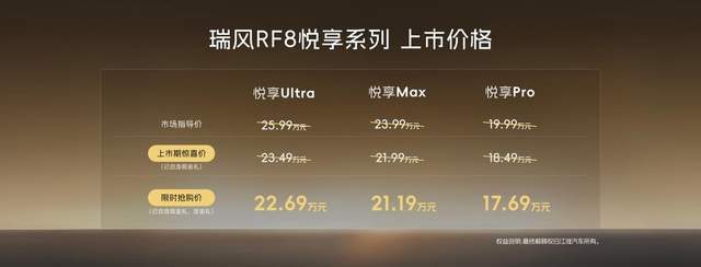 此次上市的瑞风RF8悦享系列共推出三个版本:悦享Pro版限时抢购价17.69万元,悦享Max版限时抢购价21.19万元,悦享Ultra版限时抢购价22.69万元。同时,瑞风为首批用户准备了至高价值70888元的7重尊享购车大礼,并为老车主提供免费升级原厂车钥匙或HiCar智慧车生活、1666元升级原厂NVH静音包的双重专属感恩权益。