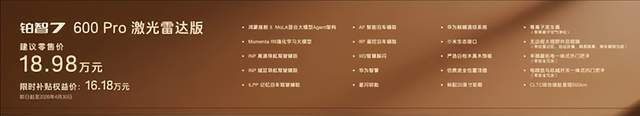铂智7600Pro版,版本基础配置不基础,入门即豪华,限时补贴权益价14.78万。同价位最大尺寸旗舰轿车,标配内置MoLA架构的鸿蒙座舱5,具备类人化智能交互,搭载带智能泊车的L2级智驾、华为智擎、尊界同款星闪钥匙、纯天然实木内饰和座椅通风加热、20寸轮毂等超15项豪华配置。