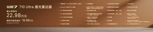 顶配710 Ultra激光雷达版限时补贴权益价19.98万,不仅集齐鸿蒙座舱和激光雷达智驾、双腔空悬、零重力座椅、23扬声器等全豪华配置,实现豪华“一步到位”,还把给足情绪价值的27英寸全景HUD抬头显示、NAPPA真皮方向盘和座椅、智能香氛系统等统统安排,是同价位最超值的选择。