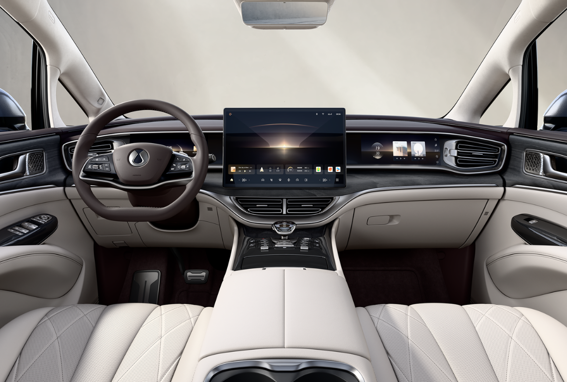 内饰部分调整较大,前排布局经过重新设计,新车采用全新电子怀挡换挡机构,中央岛台前端设置有多个常用的物理按键,更适合盲操,配备双手机无线充电面板和开放式双杯架,整体看起来更加规整。副驾屏升级为开合屏,展开之后屏幕比例更符合日常观看习惯,还能形成一个小置物台,可以放置一些小物品。第二排座椅是MPV车型上的重中之重,新款腾势D9的二排座椅升级零重力模式,车顶还升级了吸顶屏,无论是观影还是长途乘坐的体验会更好。