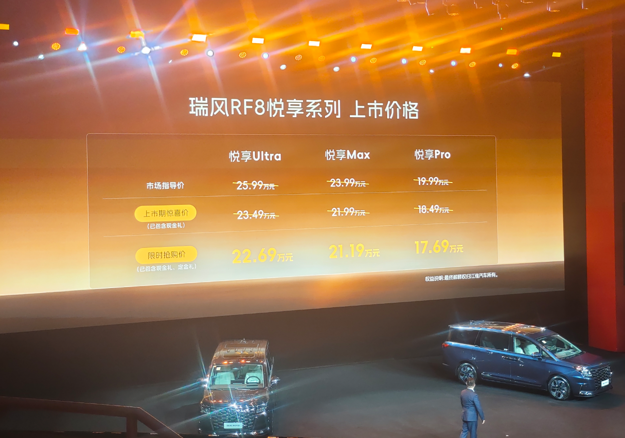 作为活动当天的重要一环,瑞风 RF8 悦享系列正式亮相并公布上市售价。新车推出Pro、Max、Ultra 三款配置版本,限时抢购价17.69万-22.69万元。这款车定位为“全能满配,越级舒享 MPV”,以“好开、好坐、安心”三把钥匙,满足了事业与家庭双重担当的用户需求。是瑞风品牌25周年献给百万用户的一封“深情家书”。