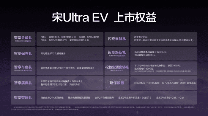 除此之外,比亚迪还给出了“0元购、0元用、0元养”的重磅购车权益,福利十足。综合来看,宋Ultra EV续航、动力、空间、智能、安全样样顶尖,价格还实惠,绝对是2026年最值得买的纯电SUV。