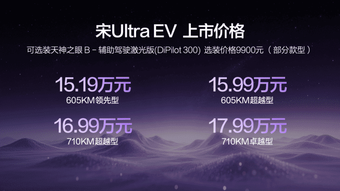 3月26日,比亚迪宋Ultra EV正式上市,一共推出4款车型,续航分605公里和710公里两个版本,官方指导价15.19万到17.99万元,价格亲民,配置还拉满,直接把B级纯电SUV的门槛打了下来。比亚迪以颠覆技术打造越级体验,让这款新车成为同级别中的佼佼者。