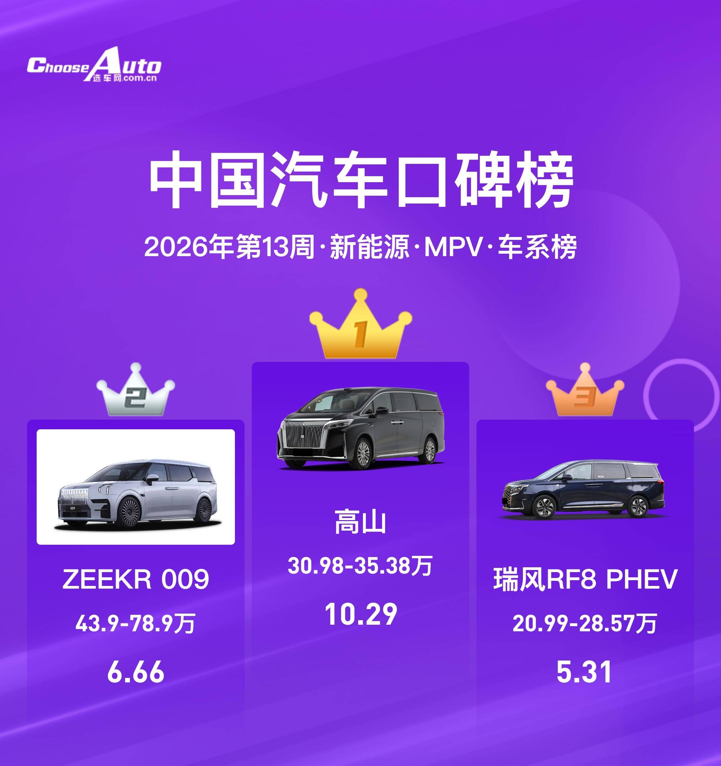 MPV榜单的口碑分数整体偏低(最高仅10.29分),且三款车型的价格跨度极大(从20.99万到78.9万)。这一现象可能指向两个现实:新能源MPV的用户基数相对较小,口碑样本量有限,导致分数绝对值偏低;高端MPV(如ZEEKR 009)与家用MPV(如瑞风RF8 PHEV)的用户评价体系完全不同,却被纳入同一榜单维度,造成"分数扁平化"。