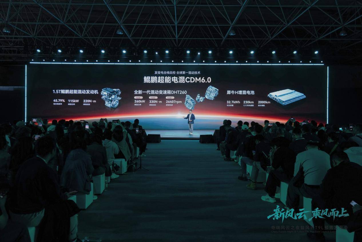在核心的三电系统上,风云T9L搭载奇瑞全栈自研的鲲鹏超能电混CDM6.0系统,以“235”全能核心实力终结行业偏科怪圈:综合续航超2000公里,馈电油耗3.9L/100km,零百加速5秒级。堪称“环保大V8”。1.5T混动专用发动机热效率45.79%,系统综合功率550kW——性能与节能,不再二选一。