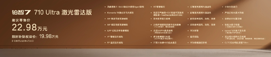 顶配710 Ultra激光雷达版限时补贴权益价19.98万,不仅集齐鸿蒙座舱和激光雷达智驾、双腔空悬、零重力座椅、23扬声器等全豪华配置,实现豪华“一步到位”,还把给足情绪价值的27英寸全景HUD抬头显示、NAPPA真皮方向盘和座椅、智能香氛系统等统统安排,是同价位最超值的选择。