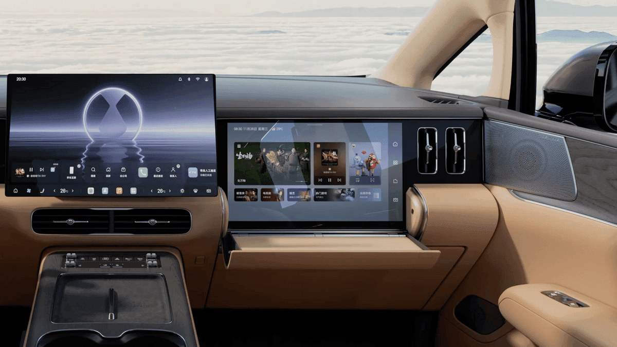 副驾配备的开合智能屏,满足多场景娱乐需求:平时可以放歌、刷短视频;想要观影时,翻下大屏,尽享沉浸式观影体验。贴心的是,翻下来的小桌板还可放置太阳镜、耳机等随身物件,细节处见豪华。