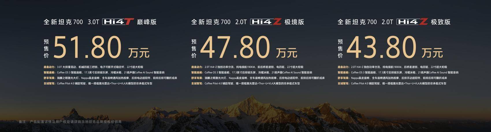动力方面,全新坦克700提供3.0T Hi4-T与2.0T Hi4-Z双旗舰动力选择,一套满足极限越野极致性能,一套主打城市泛越野全能无短板,彻底打破“强悍不智能、豪华不越野”的品类固有边界。