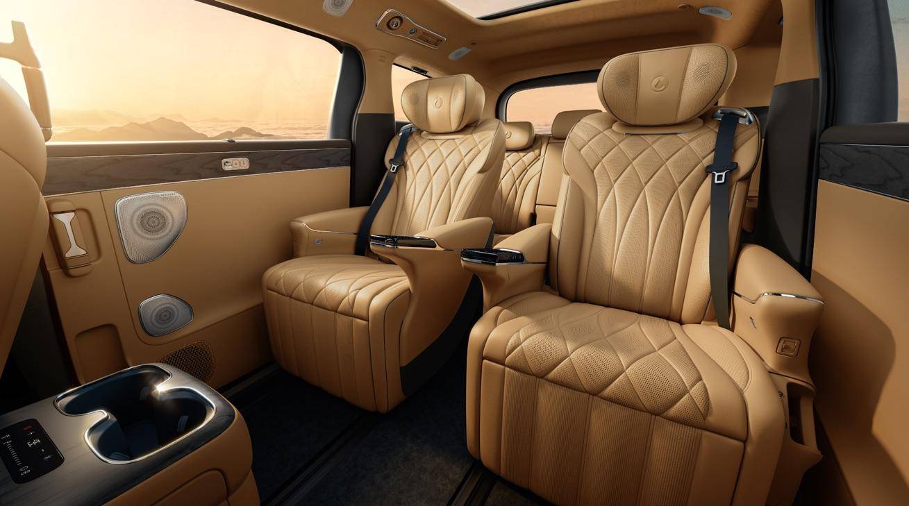 内饰更是重头戏。标配怀挡,前排空间豁然开朗。NAPPA真皮座椅+精致绗缝,触感细腻得不像这个价位的车。中排零压云绒座椅,独创丝柔悬浮层——坐上去的感觉,像被云朵托着。配合按摩、电动调节,头等舱也不过如此。副驾配备的开合智能屏,是个巧妙的设计:平时折叠起来放歌、刷短视频;想看片时翻下来,大屏沉浸观影。更贴心的是,翻下来的小桌板可以放太阳镜、耳机,这些使用细节。