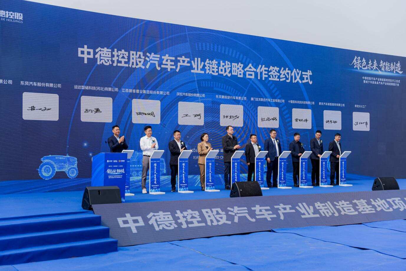 仪式上还举行了隆重的中德合作企业签约环节。中德控股集团与东风汽车股份有限公司、运达智储科技(河北)有限公司、江西赣锋锂业集团股份有限公司、庆铃汽车股份有限公司、东风襄阳旅行车有限公司、厦门金龙联合汽车工业有限公司、十堰国科鸿鹄科技有限公司、蔚来汽车销售服务有限公司、奔驰大G工厂等多家知名企业达成战略合作,标志着一条紧密协作、互利共赢的上下游产业链正在嘉鱼加速成型。