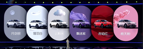 配色方面也很有看点,新车提供了月剑银、翎羽白、云粉米、飘逸紫、赤焰红、桃夭粉共六种车身配色,另外还支持36色DIY车顶,也能看出新车主要针对年轻用户。