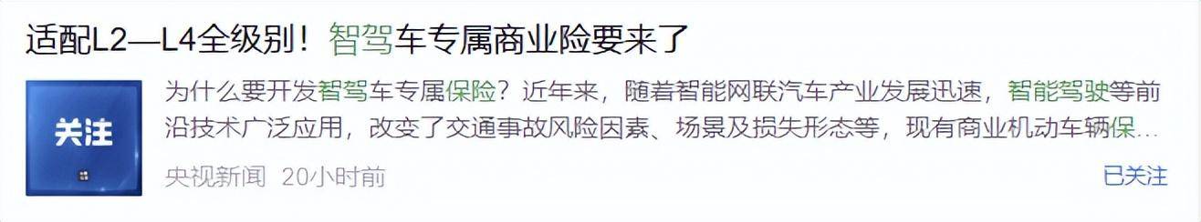没有一点点防备,也没有一点点预兆,央视新闻在昨晚把一篇《适配L2—L4全级别!智驾车专属商业险要来了》丢进了最近沉寂的智驾圈。