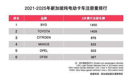 在电动卡车领域,比亚迪于2020年进入新加坡,开始向当地正式交付环卫车T9,成为当地第一家销售电动卡车的公司。2021年-2025年,比亚迪纯电卡车在新加坡五年累计注册量达1450台,排行第一。