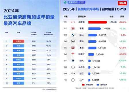 近期,据新加坡陆路交通管理局数据显示,2025年,比亚迪乘用车在新加坡销售11184辆,同比增长80.6%,蝉联年度全品牌销量冠军。自2022年,比亚迪正式进入新加坡乘用车市场,仅用两年时间成功登顶榜首,助力新加坡电动化转型。