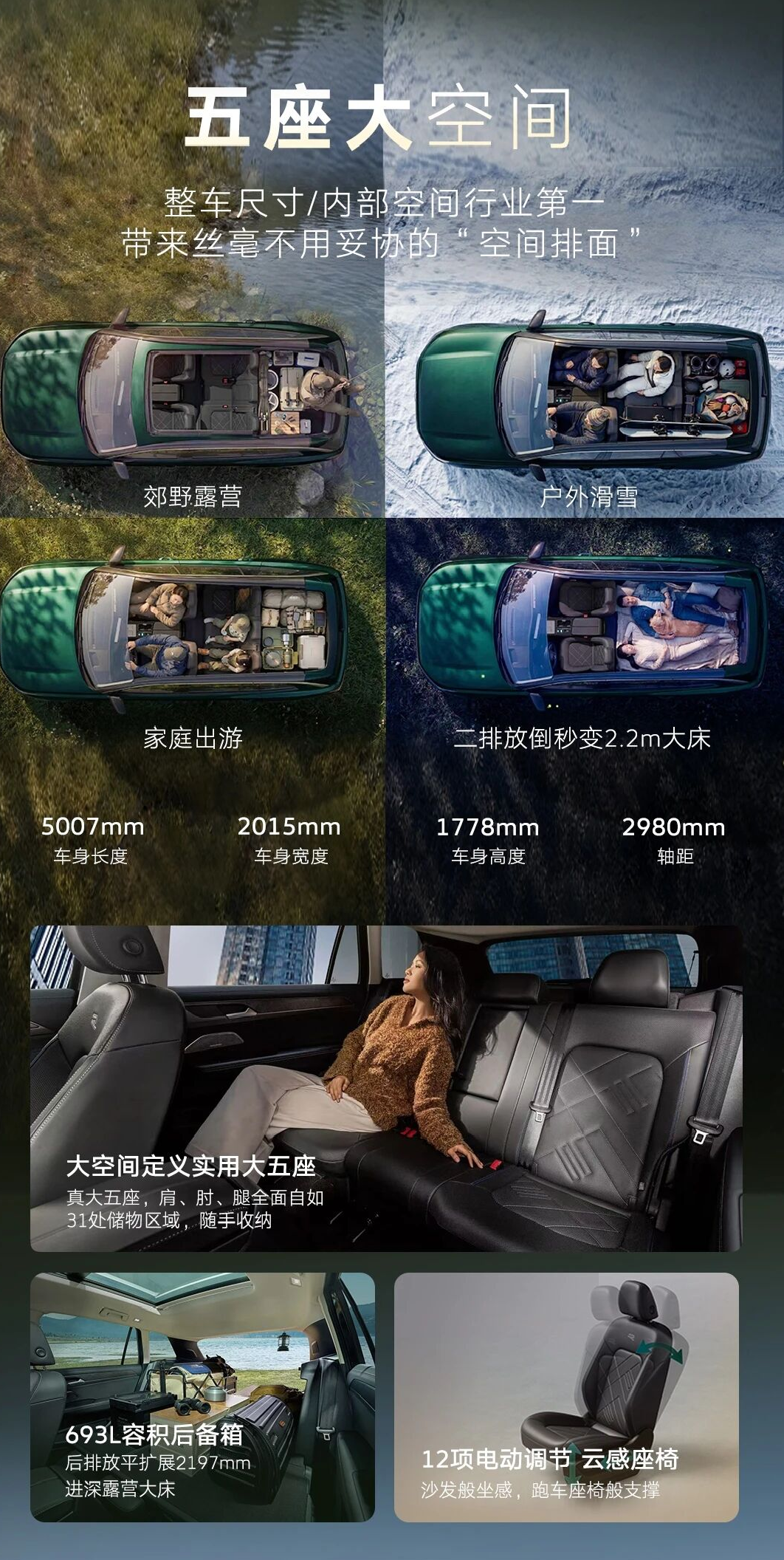 最让人惊喜的是它的后备箱,常规状态下就有693L的空间,能轻松放下儿童车、行李箱、露营装备,要是把后排座椅放倒,还能拓展出更大的纯平空间,不管是搬大件物品,还是出去露营当休息区,都完全够用。